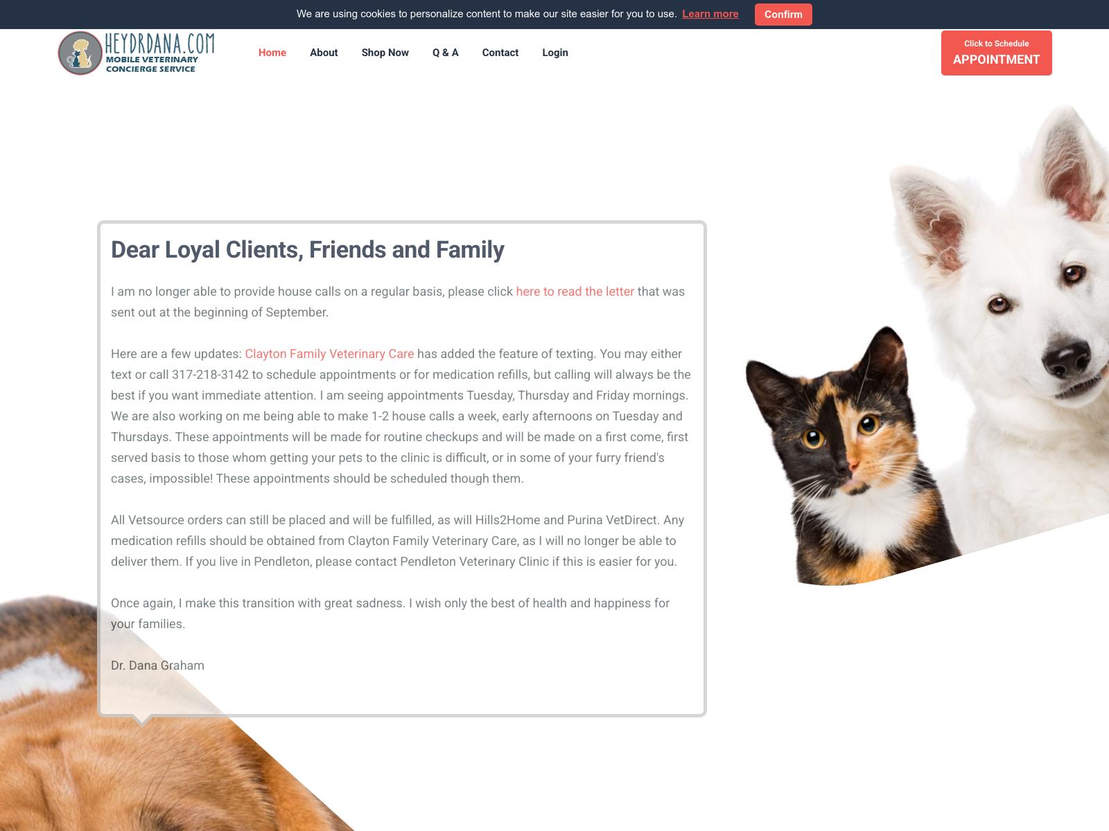 The Hey Dr Dana website is so much more than a website, as well as handling patient/customer records and S.O.A.P data it can also act as an online scheduling tool, accept payment for an appointment, generate rabies tags, PDF files and much much more!